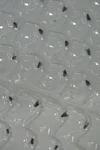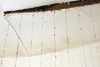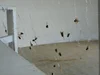 Curtain of red hot glue strands with embedded flies, hanging from ceiling